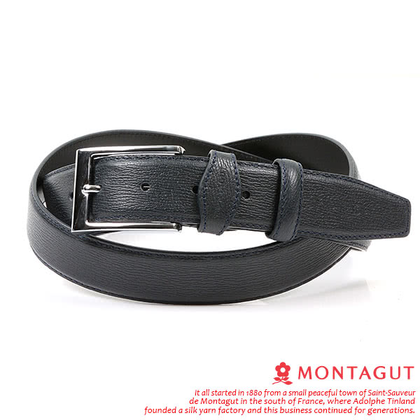 【MONTAGUT夢特嬌】中深藍雙車線 頭層牛皮休閒針扣皮帶(551)指名首選